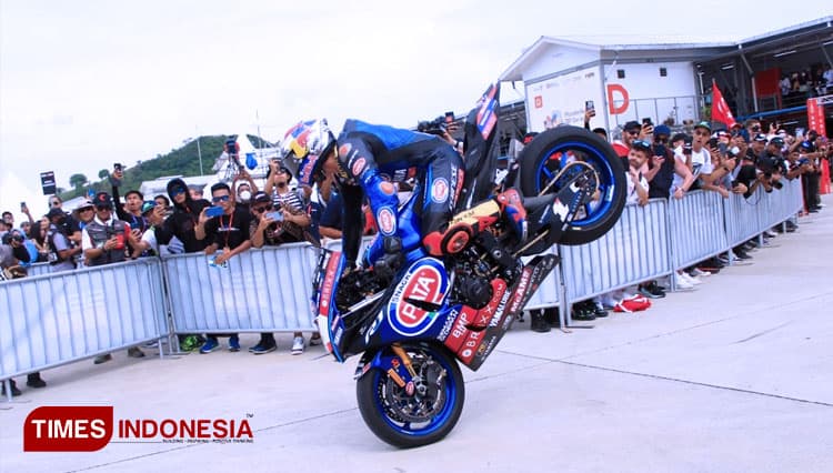 TIMES Jambi/Pembalap PATA Yamaha Brixx Toprak Razgatlioglu melakukan atraksi stopie ban depan usai memenangi race 1 WSBK Mandalika 2022, Sabtu (12/11/2022). (FOTO: Tria Adha/TIMES Indonesia).