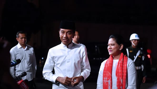 TIMES Jambi/Capres nomor urut 01 Joko Widodo bersama istri Iriana Joko Widodo tiba di lokasi untuk mengikuti debat Pilpres 2019 putaran kelima, di Hotel Sultan, Jakarta, Sabtu (13/4/2019). (FOTO: Rivan Awal Lingga/Antarafoto)