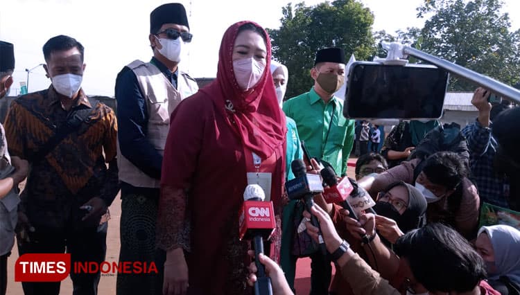 TIMES Jambi/Putri Abdurrahman Wahid (Gus Dur) Yeny Wahid saat diwawancarai oleh awak media. (FOTO: Moh Ramli/TIMES Indonesia)