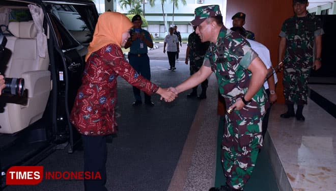 TIMES Jambi/Pangdam V/Brawijaya, Mayjen TNI Wisnoe, P.B, menyambut kedatangan Gubernur Jatim, Khofifah Indar Parawansa di Makodam V/Brawijaya, Rabu (20/2/2019).(Foto: Istimewa)